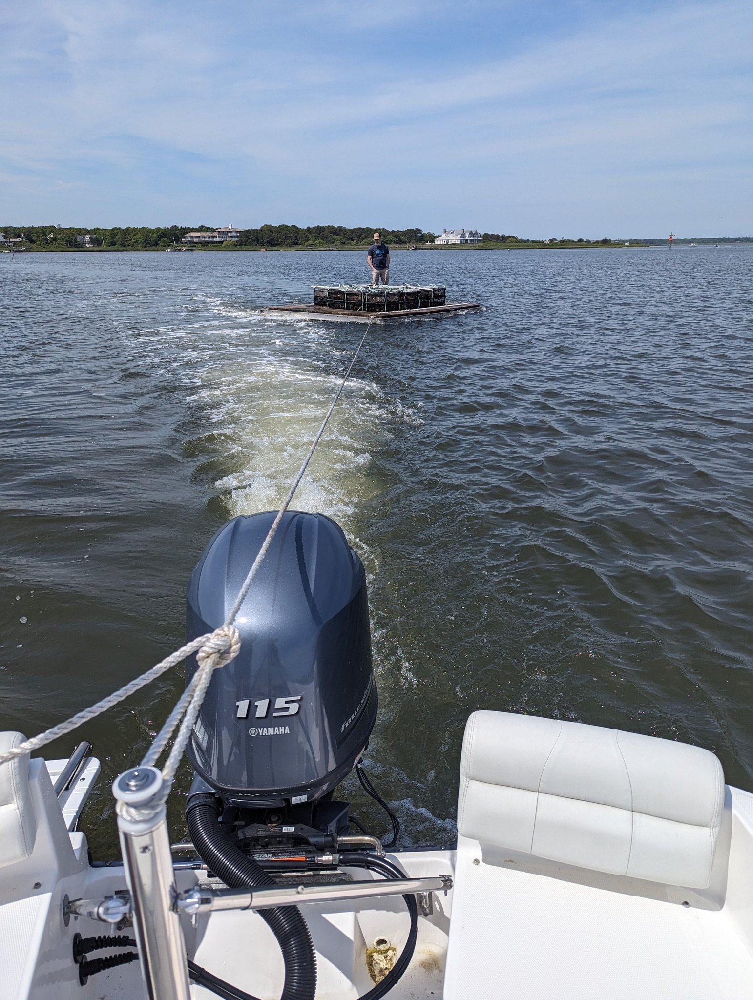 Launching from a dock generously made available by one of our Quogue Stewardship community donors, site sponsor Andrew Lynch joined the team, lending his personal boat to help transfer the 24 trays of SOS into the Restoration Raft. These oysters will continue to feed on wild phytoplankton and filter the surrounding water.