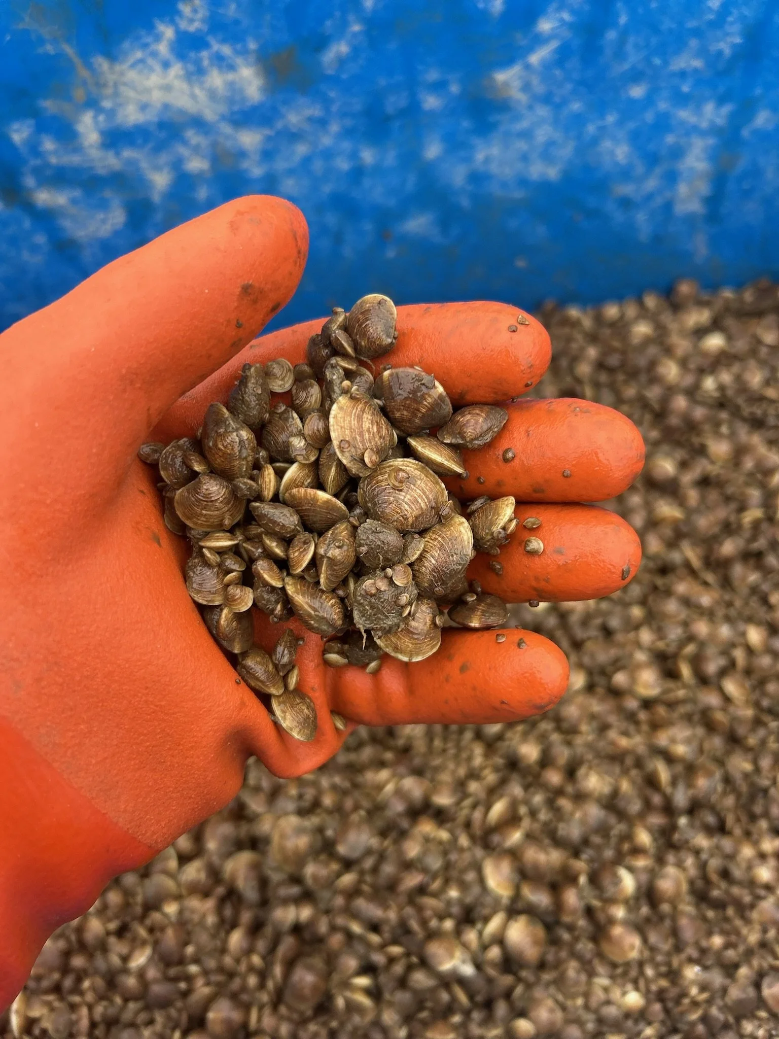 Oysters and clams naturally exist together in the same ecosystem, so pairing these species in our restoration efforts helps us see greater long-term success. I will check on the clams next fall, however I won’t expect to dig up any big ones quite yet – it takes 3-5 years for them to just reach littleneck size! Patience is key, but keep checking back for any updates!