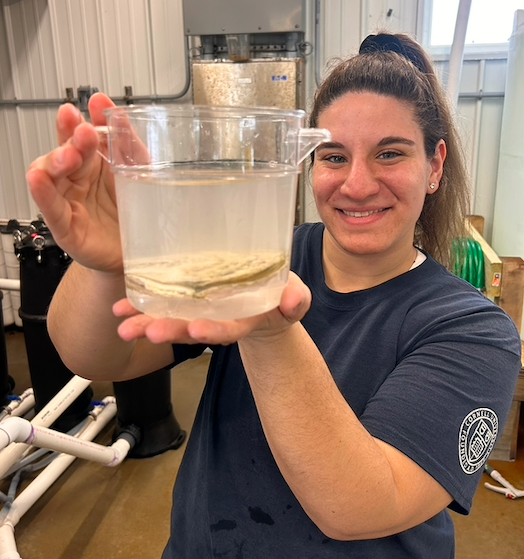 Danielle (Hatchery Manager) displaying a female oyster releasing its eggs