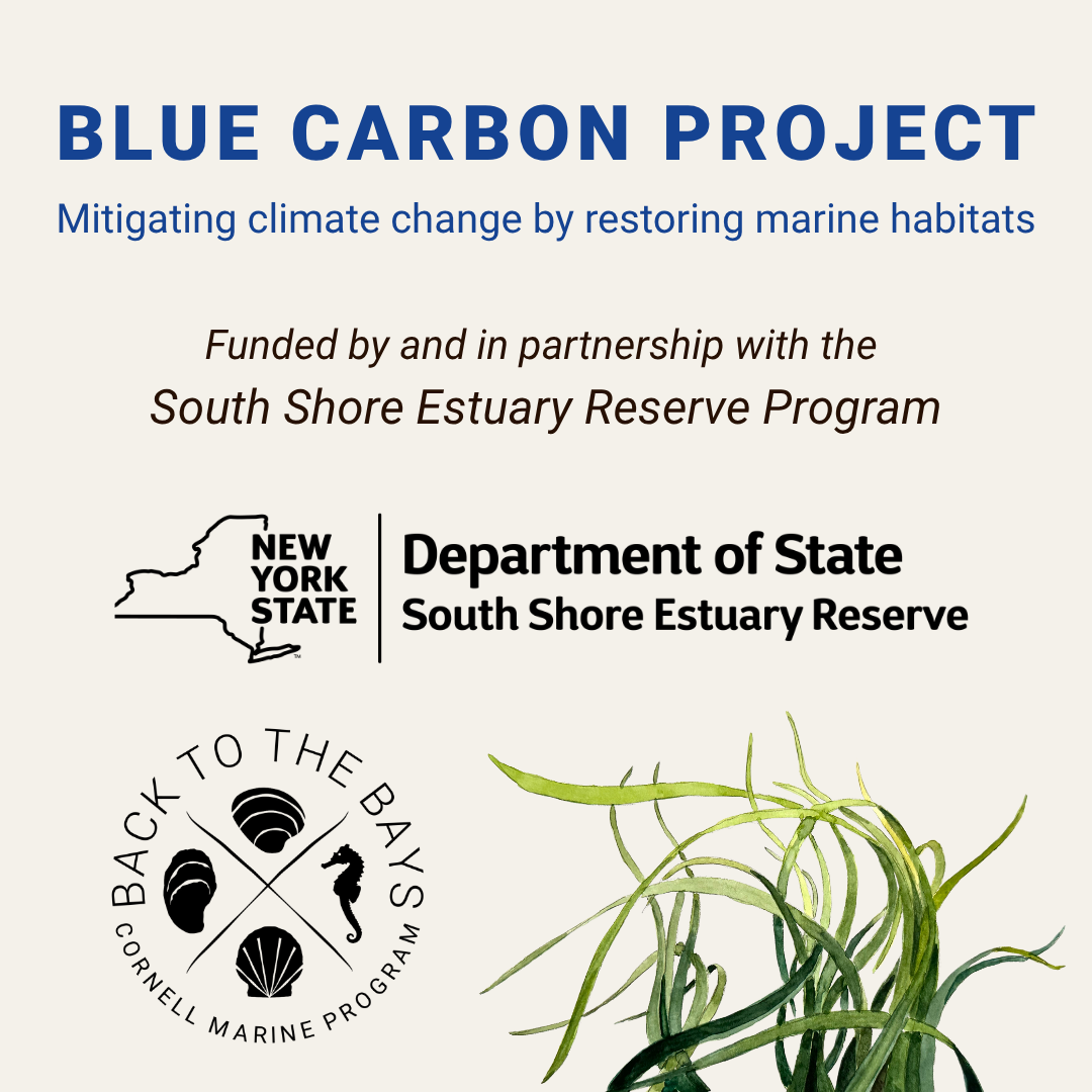 Blue Carbon refers to the carbon dioxide captured and stored by oceans and coastal ecosystems, such as seagrass meadows and salt marshes. These Blue Carbon Ecosystems play a crucial role in reducing atmospheric carbon dioxide, thereby mitigating climate change. With funding from the South Shore Estuary Reserve Program, Cornell Cooperative Extension’s Back to the Bays Initiative will provide a presentation on Blue Carbon in the Nature Center and then engage participants with a hands-on activity to help with seagrass restoration. Community service hours will be provided upon request.