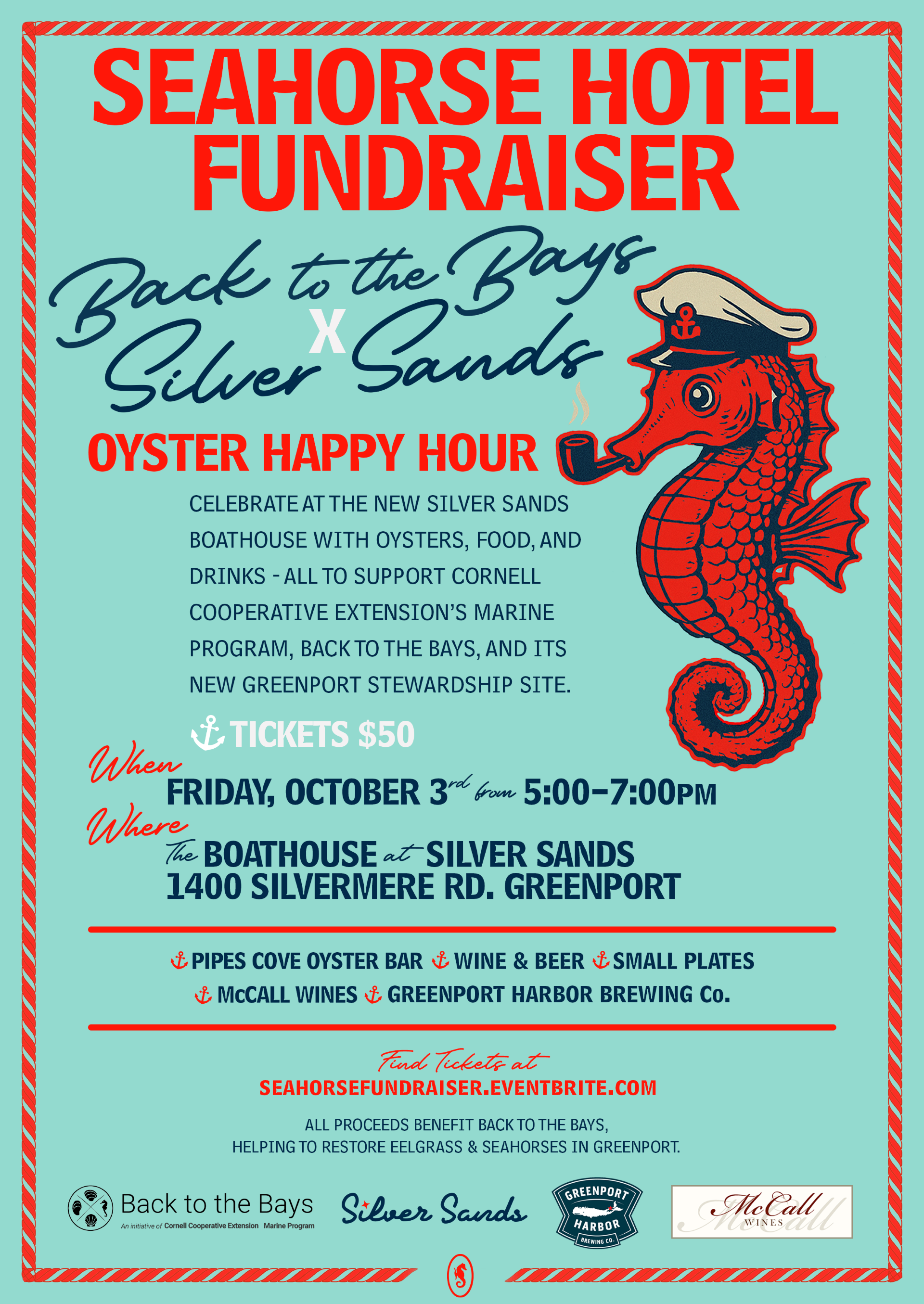 All proceeds will directly support the Back to the Bays Greenport Stewardship Site, helping to restore and revitalize native marine species including eelgrass and the Northern Lined Seahorse.