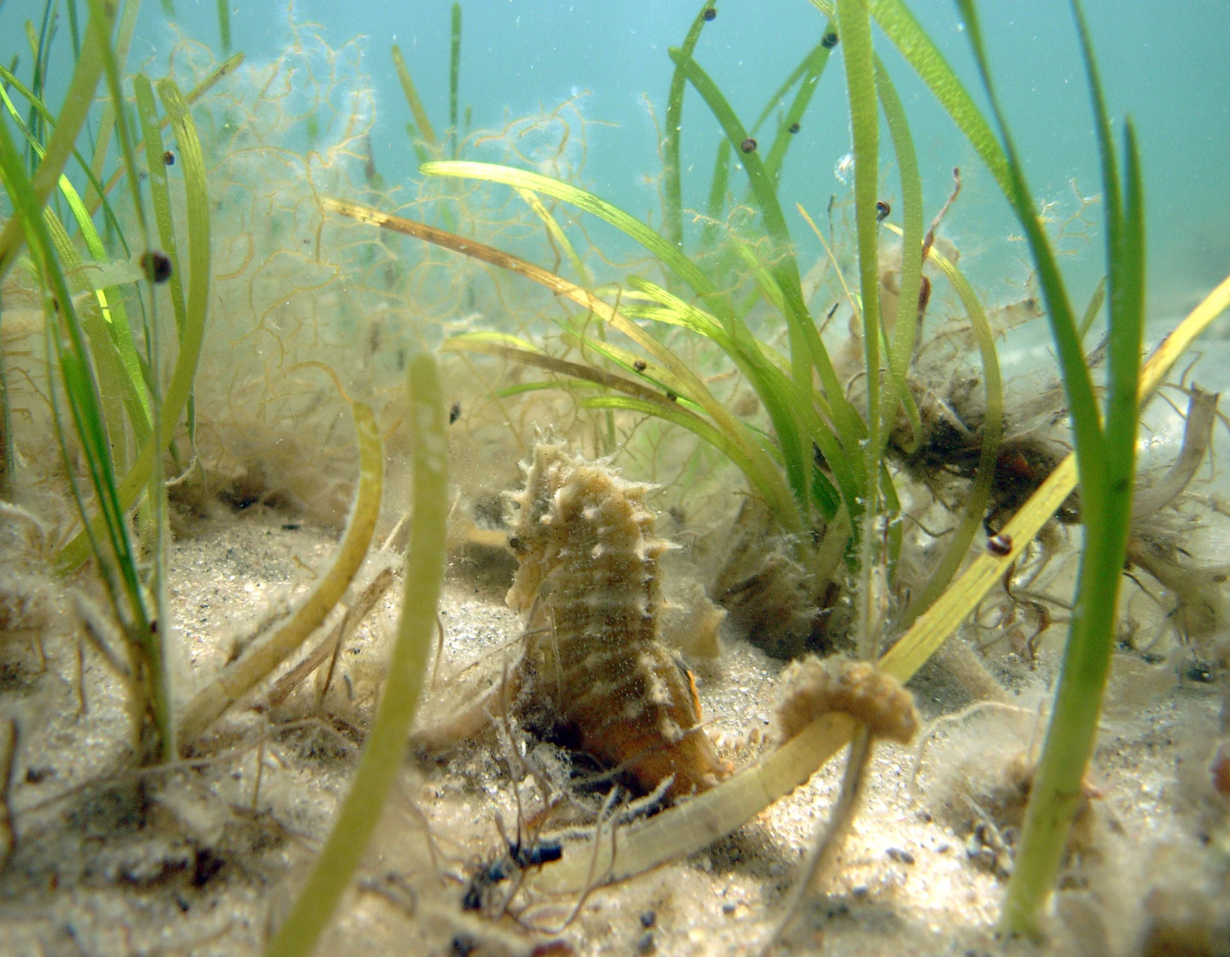 Eelgrass is the preferred habitat of our native seahorse species, the Northern Lined Seahorse (Hippocampus erectus). Seahorses evolved prehensile tails to cling to eelgrass and other stable structures, allowing them to remain in their territory with their pair-bonded mate.